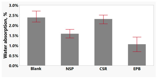 From Figure 8, different tougheners have different effects on the water absorption of this UV-cured epoxy system. Compared to pure epoxy systems, NSP and EPB systems have lower water absorption, especially EPB systems. After participating in epoxy resin crosslinking and curing in a cationic UV system, the crosslinking density is reduced, resulting in an increase in free volume and a decrease in the system’s moisture resistance. In addition, EPB is rich in hydrophobic C-H bonds, which form a homogeneous structure with epoxy resin during the curing process, which can improve moisture resistance. The interaction between the two results in almost no change in the water absorption rate of the system.