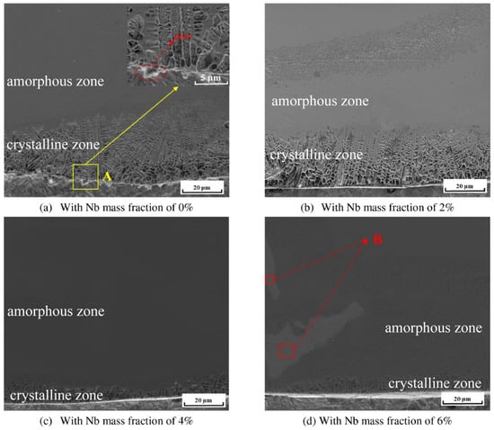 Compared to other elements, Nb possesses a notably large atomic radius, low solubility with other elements during solidification, and a propensity to cluster at the solid–liquid interface, inhibiting grain growth. Wang et al. [38] fabricated Fe-Cr-Mo-Co-C-B-Nb alloy coatings on 45 steel surfaces with Nb mass fractions of 0%, 2%, 4%, and 6%. As demonstrated in Figure 2, the crystalline zone at the interface between the substrate and the coating diminishes with increasing Nb content. From the enlarged view of A in Figure 2a, it can be seen that there are many pores in the bonding zones without Nb addition. The inclusion of Nb results in the disappearance of pores in the bonding zone, leading to a more cohesive interface and improved bonding strength. Additionally, introducing a modest amount of Nb to both low-carbon steel and stainless steel not only causes significant lattice distortion but also promotes the formation of fine secondary phases, substantially enhancing the mechanical attributes of the cladding layer. In a separate study, Liu et al. [28] infused varying Nb concentrations into 316 L stainless steel cladding coatings. As the Nb content increased, lattice distortion occurred, bolstering the solid solution effect, refining the grain size, and augmenting the formation of new Laves phases. These factors enhanced the coating’s hardness. Moreover, with the integration of Nb, it accumulates on the surface, forming an oxidized Nb film. Coatings containing a 1% Nb mass fraction demonstrated superior corrosion resistance. However, an excessive Nb presence increased susceptibility to corrosion, consequently compromising the coating’s corrosion resistance.