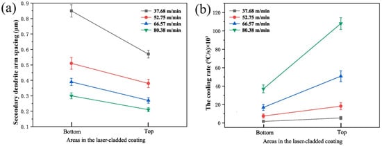 Distance between secondary dendrite arms (a) and the cooling rate (b) of the coating during laser cladding at varying scanning speeds [84].