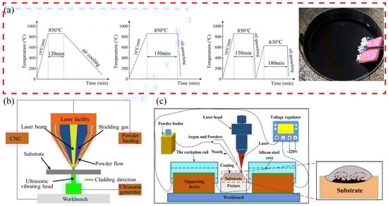 Schematic illustration the heat treatment processes and quenching process (a) [97], induction heating-assisted laser cladding (b) [98], and electromagnetic field-assisted laser cladding (c) [99].