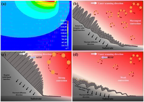 Schematic diagram for the simulated temperature distribution of laser cladding 316 L stainless steel powders (a) and schematic diagram showing the crystal growth and convection in the laser cladding layer with different fabrication states (b–d) [117].