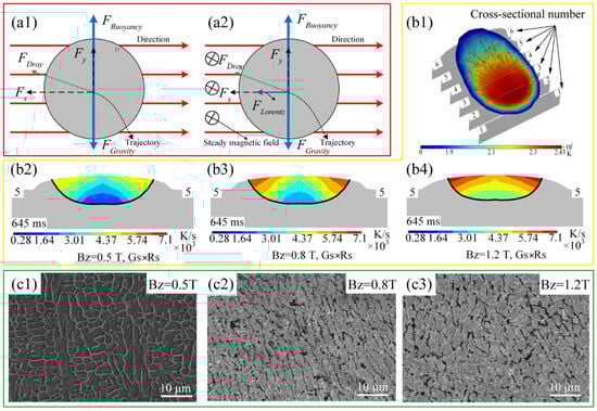 (a1,a2) Force analysis of melt pool liquid; (b1) cross-section positions; (b2–b4) cross-section cooling rates at different magnetic fields; and (c1–c3) microstructures at different magnetic fields [118].