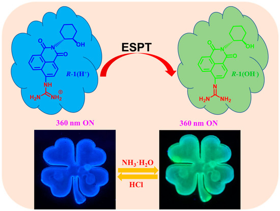 In recent times, organic molecules possessing ESPT properties have drawn significant attention due to their diverse applications in the realms of information storage and security devices [26,27]. Extensive efforts have been directed towards inducing ESPT processes within biological systems and chiral nematic liquid crystal systems [28,29,30]. Simultaneously, researchers have explored the sensitivity of ESPT signals to external stimuli, aiming to fabricate responsive functional materials that exhibit fluorescence color variations. This exploration holds promise for applications in photonics and biomedicine. Nevertheless, the number of reported molecules exhibiting intermolecular ESPT properties remains relatively limited. In a prior study, we successfully engineered a water-soluble chiral emitter with circularly polarized luminescence (CPL) activity, derived from guanidine-substituted 1,8-naphthalimide (R/S-1). The described sequence delineates the process of excited-state proton transfer in R-1 molecules. In an acidic and neutral environment, the predominant species of R-1 molecules exists in the protonated state, denoted as (R-1)+. Upon excitation at 350 nm, a subset of the excited molecules undergoes a rapid transformation from the protonated state ((R-1)+) to the excited deprotonated form ((R-1)), facilitated by an intermolecular excited-state proton transfer process from the molecules to the solvent. Subsequently, the (R-1)* molecules undergo a transition back to the ground state R-1. Following their return to the ground state, the R-1 molecules undergo a reverse proton transfer, leading them back to the protonated form ((R-1)+). This emitter demonstrated the capability to undergo intermolecular ESPT processes across a range of pH values in aqueous solutions, resulting in tunable CPL with varying colors [30].