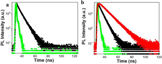 (a) Time-resolved fluorescence spectra of R-1/PMMA composite film in an acidic environment, emission: 425 nm. (b) Time-resolved fluorescence spectra of R-1/PMMA composite film in an alkaline environment, emission: 425 nm and 506 nm. Black curve, (R-1)+* emission; red curve, (R-1)* emission; instrument response function (green curve); (λex = 350 nm).