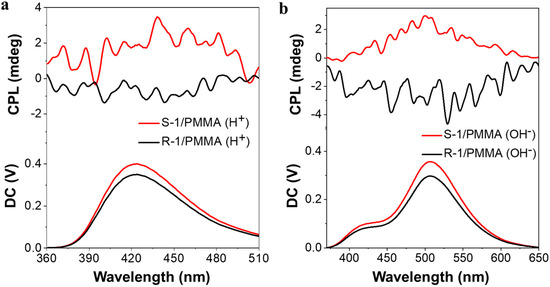 Considering that the R-1 molecule is chiral, the chiroptical properties of the R-1/PMMA composite film and its enantiomer S-1/PMMA were further characterized. When R-1/PMMA was exposed to an acidic environment, a pair of blue circularly polarized light signals were observed at 425 nm. Specifically, R-1/PMMA exhibited a right-handed circularly polarized luminescent signal, while conversely, S-1/PMMA exhibited a positive circularly polarized luminescent signal, as shown in Figure 4a. Through calculations, the luminescent dissymmetry factor was found to be on the order of 10−4. Additionally, when R-1/PMMA was exposed to an alkaline environment, a symmetric set of yellow-green circularly polarized light signals was similarly obtained, as shown in Figure 4b. These results indicated that the film formed by the composite of R-1 and PMMA also possessed chiral luminescent properties.