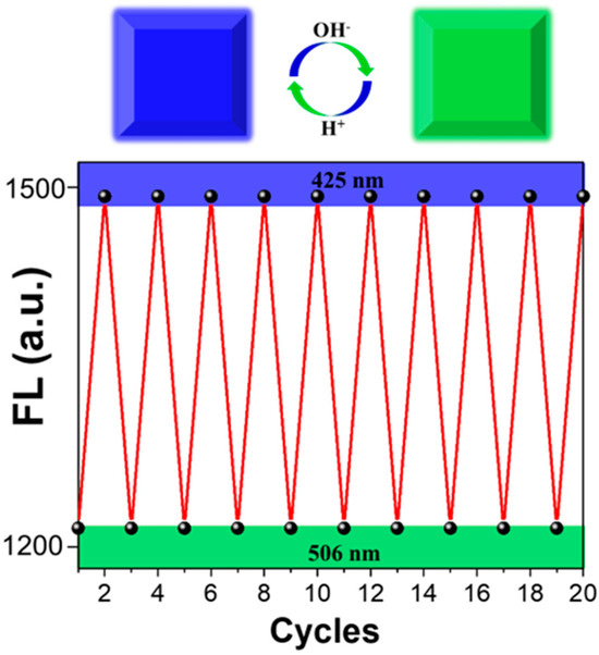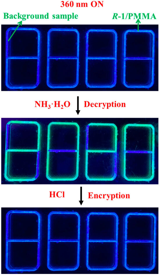 The stimulus-responsive fluorescence alterations exhibited by the R-1/PMMA film open avenues for its application in information encryption. Figure 5 illustrates an array initially displaying the number ‘8888’, representing the encrypted state of information within the R-1/PMMA film. Upon exposure to an alkaline environment and subsequent irradiation with 365 nm light, the array effortlessly transformed into the number ‘2020’, accompanied by a shift in color from sky blue to yellow-green. This transition signifies the decryption state of the information, with concentrated ammonia water serving as the decryption agent. Furthermore, exposure to an acidic environment, leading to the protonation of guanidine groups in the R-1 molecule, facilitates the return of the mixed film to its original state under ultraviolet light irradiation, utilizing concentrated hydrochloric acid as the densifier. At this point, the entire system has reverted back to its encrypted state. As shown in Figure 6, the pH-induced fluorescence changes of R-1/PMMA was reversible and reproducible for at least ten cycles, demonstrating that the R-1/PMMA composite exhibited elevated fatigue resistance. The stimulus responsiveness and robust fatigue resistance of R-1 molecules allow for multiple cycling of the information security system prepared using the R-1/PMMA film. Consequently, the conceptual demonstration of the R-1/PMMA thin film system with adjustable stimulus-responsive fluorescence showcases promising potential for information encoding and decoding.
