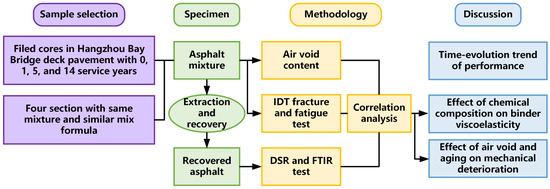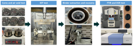 Pavement cores from various years were drilled from the pavement and measured for diameter and height. Subsequently, the air void ratio and indirect tension (IDT) tests were conducted on the mixture cores. After the IDT testing, the mixture cores were heated, dispersed, and then soaked in trichloroethylene to dissolve the asphalt binder. Finally, the field-aged binders were extracted and recovered according to AASHTO T 319 [14] and then underwent the FTIR and DSR test. A flowchart of sample preparation and performance test is summarized in Figure 6.