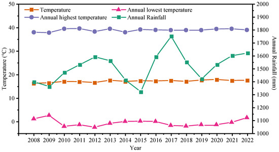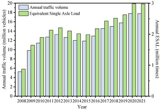 The Hangzhou Bay Bridge, located in Zhejiang Province, China, connects the cities of Jiaxing and Ningbo. The bridge is exposed to a subtropical monsoon climate characterized by high humidity and significant rainfall, with the climate data summarized in Figure 2. The bridge has two layers of deck pavement: the upper layer consists of a 4 cm thick SMA 13 (Stone Mastic Asphalt with a nominal maximum aggregate size of 13 mm), and the lower layer consists of a 6 cm thick SMA 16 (Stone Mastic Asphalt with a nominal maximum aggregate size of 16 mm). The bridge was open to traffic in 2008 and the annual traffic volume data are presented in Figure 3. The Equivalent Single Axle Load (ESAL) is a standardized unit used to quantify the relative damage caused by various axle loads compared to a standard 100 kN single axle load.