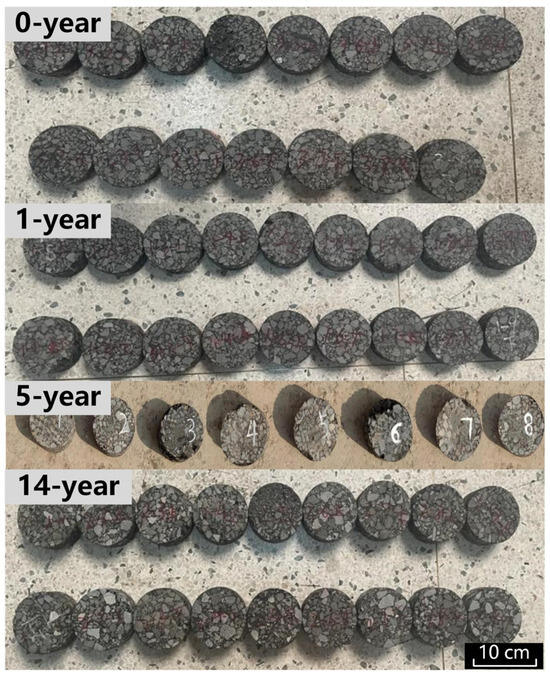 The material properties and mix-design parameters of pavement cores are shown in Table 3 and Figure 5. As indicated in Table 3, core samples from different years utilized the same PG grade of SBS-modified asphalt, with mix design parameters and differing by no more than 5%.