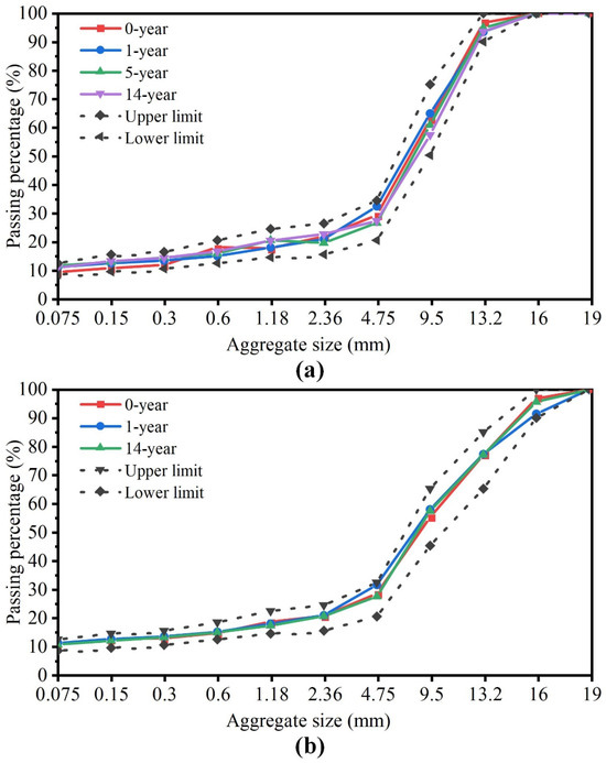 Gradation of pavement cores: (a) SMA 13 for upper layer, (b) SMA16 for lower layer.