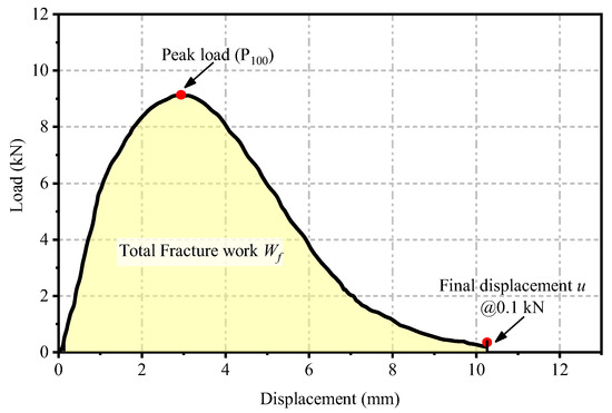 The indirect tension (IDT) test characterizes the strength of asphalt mixtures by applying a load across the vertical diametral plane of a cylindrical specimen, which produces tensile stress in the lateral (horizontal) direction. In this study, the IDT fracture test was conducted in accordance with ASTM D6931 [18], at a temperature of 15 °C, employing a loading rate of 50 mm/min with the UTM-100 system (IPC Global, Melbourne, Victoria, Australia). The test was terminated upon reaching a load of less than 0.1 kN. Load-displacement curves were recorded and analyzed, as depicted in Figure 7. Subsequently, based on the load–displacement curve, the following parameters of interest were calculated by Equations (3) and (4) [19], adhering to ASTM D8225 [20].