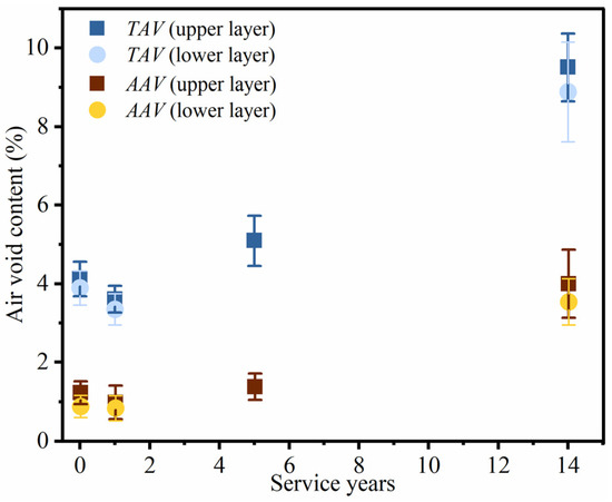 As shown in Figure 8, the air void content of the pavement underwent a slight decrease after one year of service, indicating the post-compaction by the traffic load [23]. Similar results were also found in Wang’s study [7], where the pavement void ratios decreased by 50% and 30% after two and three years of service, respectively. After the initial densification phase, internal micro-cracks gradually developed under repeated loading, resulting in an increase in TAV and AAV. After 14 years of service, TAV and AAV increased by 2.5 and 4 times, respectively. It is observed that the increasing rate of air void content accelerates over service years as the accumulated fatigue damage weakens pavement structural integrity, making it more susceptible to cracking. Additionally, the ratio of AAV to TAV gradually increased from 25% at 0 years to 35–45% at 14 years, attributed to the coalescence of existing accessible air voids with newly formed internal cracks [24]. Furthermore, the air voids in the upper and lower layers of the pavement exhibit similar trends in evolution, with the upper layer showing slightly higher air voids after 14 years of service.