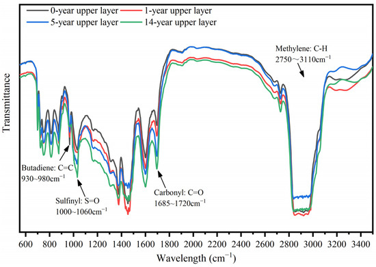 The infrared spectra of recovered asphalt samples (which ranged from 600 to 3500 cm−1) are shown in Figure 9. With prolonged service time, the absorption peak areas of carbonyl and sulfonyl groups continually increase due to asphalt oxidation. Simultaneously, the absorption peak intensity of butadiene gradually decreases due to the degradation of the polybutadiene chain segment in SBS polymer.