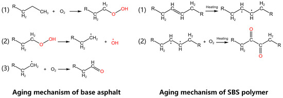 The chemical reactions during the aging of base asphalt and SBS polymer are illustrated in Figure 10. In base asphalt aging, oxygen initially reacts with perhydroaromatics to form hydroperoxides. These hydroperoxides subsequently decompose into radicals, which further react with oxygen to form ketones, resulting in the generation of carbonyl groups. In the case of SBS polymer, carbon-carbon double bonds decompose under heat to form free radicals, which then react with oxygen to form diketones.