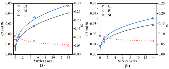 Additionally, the lower layer exhibits a slower aging rate in initially service years. Zhang [3] also observed a 20–30% lower degree of aging in the underlying layer after 1.5 years of service. This slower aging rate in the lower layer can be attributed to reduced exposure to environmental factors such as UV radiation and oxygen. After 14 years, the CI and SI of the lower layer binder reach 80% of those observed in the upper layer. Similarly, the BI index of the lower layer is 50% higher than that of the upper layer, reflecting a smaller degree of SBS degradation in the lower asphalt.