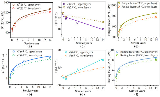 Binder’s rheological property at different service years: (a) G* at 25 °C, (b) G* at 65 °C, (c) δ at 25 °C, (d) δ at 65 °C, (e) G* × sinδ, (f) G*/sinδ.