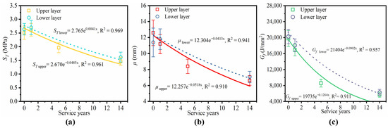 As shown in Figure 13c, the fracture energy exhibits a similar downward trend, which can be inferred from the strength and displacement curves. After 14 years of service, the fracture energy of both layer mixtures declines to approximately one-fourth of their initial values, aligning with the findings observed in study [22].