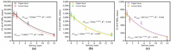 To ensure a consistent stress level, the IDT strength for different service years was averaged to obtain a mean IDT strength value of 2.23 MPa. Stress ratios of 0.2, 0.3, and 0.4 were then applied to determine the three stress levels of 0.45 MPa, 0.65 MPa, and 0.90 MPa, referred to as S1, S2, and S3, respectively. Fatigue life in this section is defined as the total number of load cycles leading to complete fracture of the specimen [26]. The fatigue life for various service years is summarized in Figure 14.