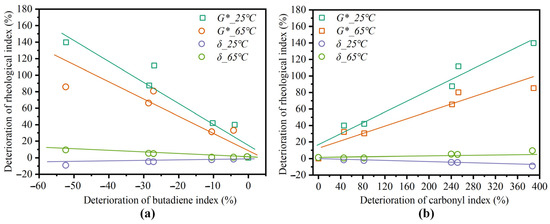 To investigate the relationship between the chemical composition and rheological properties of field-aged SBS-modified asphalt. The correlation analysis was conducted on chemical indicator (CI and BI) and rheological indicators (G* and δ at 25 °C and 65 °C). The selected variables were first normalized to the deterioration ratio (DR) using Equation (9)