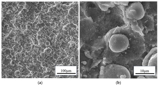The commercial Zn30Al alloy powder (70 wt.% Zn, 30 wt.% Al) used in this study was prepared by a gas atomization process with a particle size distribution of 10~35 µm. As shown in Figure 1, the Zn30Al alloy powder exhibits a predominantly spherical morphology. Previous studies have shown that coatings made from spherical powders have lower porosity due to enhanced flow during feeding and more uniform resistance in high-velocity gas streams [24,25]. The EDS test indicates that the alloy powder’s Zn to Al mass ratio is close to 7:3.