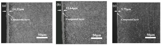 Because of the above reasons, it is necessary to obtain a plasma nitriding layer with a thicker effective hardening layer and thinner compound layer to meet the service requirements in practical applications, especially for components subjected to heavy impact loads. The following two ways are the traditional methods for making a compound layer become thinner: one is adjusting the nitriding parameters, including nitriding temperature, duration, or nitrogen potential to obtain a thinner nitrided layer [,,], and the other is grinding the very surface layer to reduce the compound layer thickness [,]. Unfortunately, the first way is generally accompanied by a thin effective hardening layer, which brings about lower surface hardness and poorer wear performance, thus making it hard to meet the requirements of long service life for components subjected to heavy impact loads, although the premature cracks can be avoided [,]. And the second way is extremely hard to control and conduct due to the very high hardness and brittleness of the compound layer.