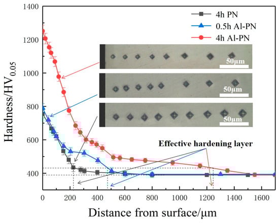 Figure 2 depicts the variation in microhardness from the surface to the bulk material after different PN treatments and with the indentations inserted. The hardness is dependent on the diagonal size of the indentations. The inserted images show that, in all cases, the diagonal size of the indentation increases with the distance from the surface, which shows that the microhardness decreases with the distance from the surface. A much smaller diagonal size of the indentations can be seen at the same distance from the surface for the 4 h Al-PN-treated sample, which corresponds to much higher hardness.