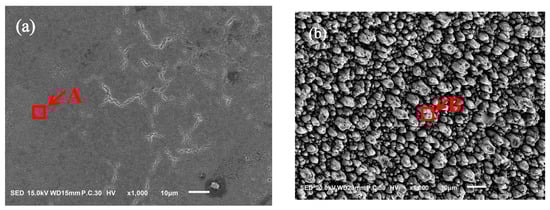 The thickness of the effective hardening layer, also called case depth, is technically defined as the vertical distance from the very surface to the position at which the hardness is 50 HV higher than that of the substrate [], and nitriding efficiency is determined by the thickness of effective hardening layer obtained per unit of time. It can be seen that the surface hardness and effective hardening layer are significantly enhanced following aluminum modification under the same process condition of 520 °C/4 h. The average surface hardness is increased from 755 HV0.05 to 1251 HV0.05, an enhancement of about 500 HV; the average effective hardening layer was dramatically increased from 224 μm to 1246 μm, an enhancement of more than 5 times, which illustrates that an ultra-high process efficiency was obtained with aluminum modification. It needs to be emphasized that a surface hardness of 790 HV0.05 and an effective hardening layer of about 435 μm were formed by aluminum-modified plasma nitriding for only 0.5 h, which is higher than 755 HV0.05 and almost twice as high as 224 μm achieved by traditional plasma nitriding after a much longer time of 4 h. Combined with the compound layer comparison shown in Figure 1, it can be concluded that a thinner compound layer and a thicker effective hardening layer can be obtained by Al-PN for 42CrMo steel, as well as higher surface hardness. It is known that the ideal characteristics of a nitriding layer for components subjected to heavy wear and/or severe impact loads are a thicker effective hardening layer and a thinner compound layer.