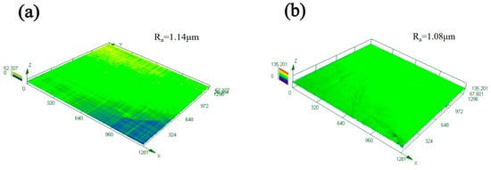 It has been reported that surface topography and roughness have a significant influence on wear behavior, and the arithmetic mean value (Ra) is considered a representative parameter of surface roughness []. Figure 5 presents the 3D surface topography and roughness of samples treated by conventional PN and Al-PN under the same process at 520 °C/4 h. It can be determined that the surface roughness Ra of PN-treated and Al-PN-treated samples is 1.14 μm and 1.08 μm, respectively, i.e., the surface roughness is decreased by aluminum modification, which may be attributed to the formation of nitrides with a very small size at the top of the compound layer, as shown in Figure 4b.
