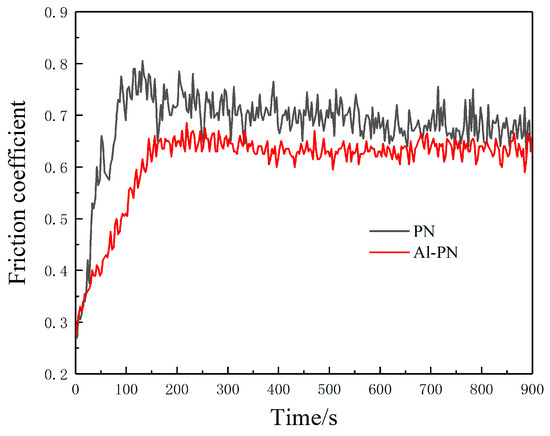 Figure 6 shows the friction coefficient of samples treated by conventional PN and Al-PN under the same process at 520 °C/4 h. It can be seen that the friction coefficient of PN-treated and Al-PN-treated samples is 0.75 and 0.64, respectively, i.e., the friction coefficient is decreased and the friction coefficient curve is more stable for the Al-PN-treated sample, which may be attributed to the corresponding lower surface roughness, as shown in Figure 5. This is because it is reported that surface roughness has more of an effect on the friction coefficient than hardness; a lower surface roughness tends to bring about a lower friction coefficient [].