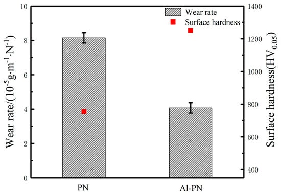 As shown in Figure 8, the wear rate of samples treated by PN and Al-PN is 8.15 × 10−5 g·N−1·m−1 and 4.07 × 10−5 g·N−1·m−1, respectively, i.e., the wear rate of the Al-PN-treated sample is decreased by half, which means that the wear resistance is enhanced by about 2 times due to aluminum modification. The extent of the decrease in the wear rate agrees well with the surface hardness data shown in Figure 8.