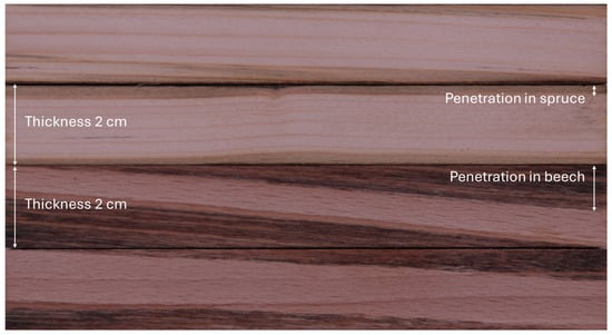 27]. Retention and spread rate can vary depending on density, porosity, moisture content, grain structure, cellular structure, wood extractives, and, of course, surface preparation. Although beech is better impregnable than spruce [