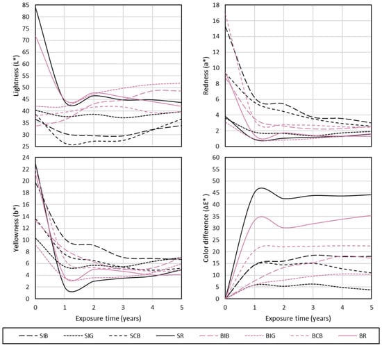 31], among others, have been reviewed in the literature. For untreated wood, the surface lightens, while its redness and yellowness decrease during weather exposure because of the degradation of chromophores in wood [