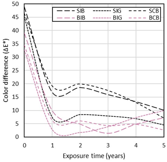 b* were probably the same for weathered samples at the beginning of the test, but the color was only measured after one year. The color measurement data of artificially weathered samples could be linked to the weathered samples to see approximately to what weathering exposure time irradiation for 1900 h corresponds. In [