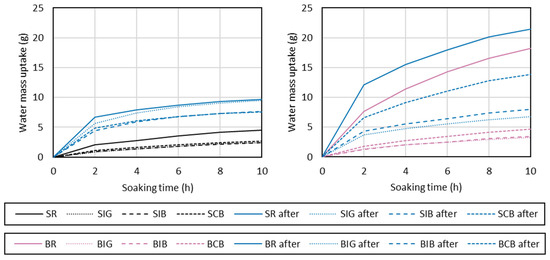 Figure 7). Beech wood absorbed more water (6.2–6.5 g) under the same conditions than spruce wood (4.6–5.0 g).