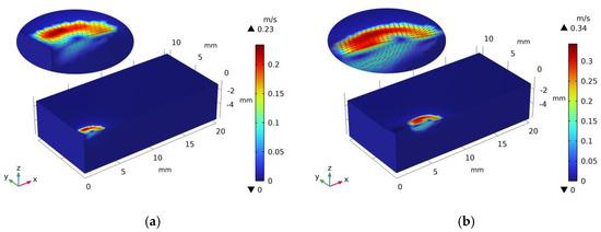 The direction of flow from the left side of the melt pool to the right side of the flow was selected, as shown in Figure 10. According to the flow field results at the time of 2.0 s, the static flow velocity under the action of acoustic flow is obtained, as shown in Figure 11a. Dimensionless the actual flow velocity, and the result is shown in Figure 11b. The acoustic streaming effect increases the flow velocity inside the melt pool, improves the flow state inside the melt pool, and promotes the flow of solute elements inside the melt pool to be more uniform.