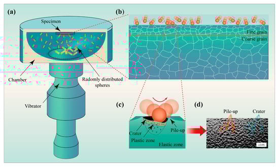 Schematic diagram of USP on GH4151 alloy: (a) experimental device, (b) dynamic process of spheres’ impact, (c) plastic zone of target, (d) target surface after USP.
