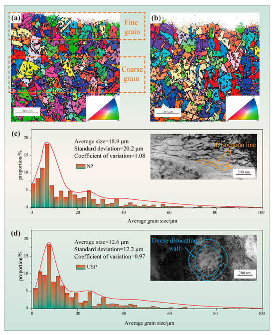 EBSD was used to investigate the microstructure of the GH4151 matrix. Figure 2a,b show the position of the target grains (orientation) of the specimen after treatment by USP and non-peened (NP), in cross-sectional view; the average grain size was 18.9 μm and 12.6 μm, respectively (Figure 2c,d). Figure 2c,d show the TEM analysis of the microstructure of the top region of the specimen after different treatments. USP produced shear bands and localized dislocations, while NP showed only a few dislocation lines distributed throughout the entire TEM foil (Figure 2c,d) [19,20]. Compared with the specimen in Figure 2d, the grain size, standard deviation, and coefficient of variation of the specimen in Figure 2c are larger, and the grain size consistency is not as good as the grain size distribution after treatment. It is shown that USP treatment is helpful in ensuring the consistency of grain size distribution on the basis of reducing the grain size. Moreover, at the same depth of the cross-section, the grain size of the specimens in Figure 2d is significantly smaller than that of the specimens in Figure 2c, indicating that USP can promote the depth of the grain refinement layer.