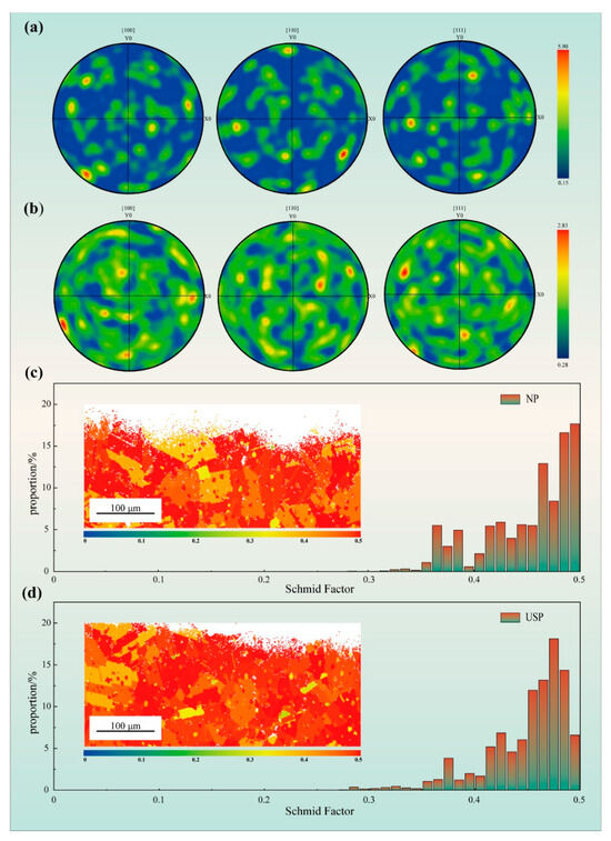 The material texture indicates the presence of the preferred orientations of grains along certain crystallographic directions, reflecting the material’s anisotropy, which significantly influences its mechanical properties and plastic deformation [21,22]. Figure 3a,b depict the pole figures obtained through EBSD for GH4151 alloy with different treatments. Under the conditions of USP, the material exhibits a reduced texture strength, with the maximum texture strength decreasing from 5.72 mud to 2.83 mud compared to the NP state. The texture becomes more randomly oriented, indicating that USP promotes the randomness of crystal orientations in GH4151 alloy [23]. The spheres, driven by the vibrating head, impart random impacts on the surface of the specimen, causing the rotation of surface grains and changes in their orientations. Figure 3c,d show the distribution of Schmid factors and the statistical relationship of Schmid factor quantities for the different specimens. The distribution of Schmid factors reflects the plastic deformation induced by USP, with a negative correlation between plastic strain and Schmid factors. The NP specimen exhibits the highest proportion of Schmid factors, close to 0.5, accounting for approximately 17.7%, indicating the characteristic of a soft orientation distribution. After USP, the proportion of Schmid factors close to 0.5 significantly decreases, indicating an increased proportion of γ-phase crystal {111} planes and <1–10> directions inclined at approximately 45° to the X-axis direction. This facilitates the easier glide of the γ-phase crystal {111}<1–10> slip systems and results in the formation of a large number of dislocations, thereby improving the fracture toughness, fatigue, and other mechanical properties of the surface layer [24,25].