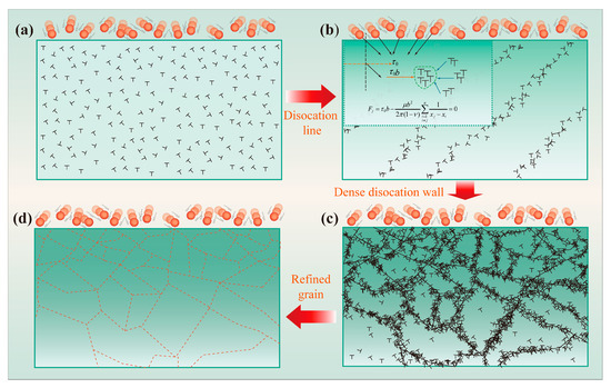 Under the influence of USP, superalloys undergo volume contraction, generating microscopic stresses within the material that induce plastic deformation [26,27]. Grain refinement is one of the main characteristics accompanying plastic deformation in the surface layer of alloys. Previous research [28,29] has acknowledged the influence of USP on grain structure, yet it has not elucidated the mechanisms responsible for these effects. The emphasis has predominantly been placed on macroscopic morphological characteristics and dislocation activities, with scant attention given to an analysis at the grain level. Figure 4 illustrates the mechanism of grain refinement during USP. The alloy of the pre-start period exhibits a scattered distribution of dislocations (Figure 4a) with a relatively low density. At the initial period, the motion of dislocations within grains leads to the formation of dislocation lines (Figure 4b) [30,31], accompanied by small magnitudes of microscopic stress. Under the influence of plastic deformation in the surface layer, dislocations inside the grains locally aggregate and form dislocation walls, dividing the original grains into individual dislocation cells (Figure 4d) [32]. At the later period, stress accumulates, causing the aggregation of dislocations into low-angle grain boundaries, resulting in grain refinement (Figure 4c). Solutes in the alloy tend to segregate near the dense regions of dislocations close to the grain boundaries. At the completion period, the distribution of precipitates near the grain boundaries increases. These fine and uniform precipitates can pin the grain boundaries, impeding dislocation motion and significantly enhancing the mechanical properties of high-temperature alloys [33]. According to the Hall–Petch equation [32,34],