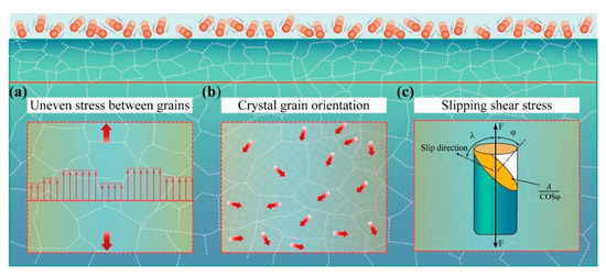Schematic diagram of microstress and orientation in grains: (a) uneven stress between grains, (b) orientation between grains, (c) Schmid factor mechanism.