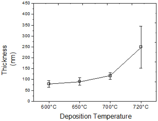 We studied the temperature influence on thickness and refractive index by fixing the deposition time at 5 min. In Figure 2, we observed a clear dependence of thickness in temperature, where thickness was increased from 75 up to 250 nm according to the increase in deposition temperature from 600 up to 720 °C. According to Liu et al. [38], the growth rate of silicon nitride films obtained by LPCVD shows an Arrhenius behavior between 730 and 830 °C. In this case, the thickness of the silicon nitride samples should be clearly increased as the deposition temperature reaches 730 °C as with our SRSN sample obtained at 720 °C. We used the mean thickness values and the minimal squares theory in OriginPro 8.0 software to obtain a fitted curve that is directly proportional to the following equation: