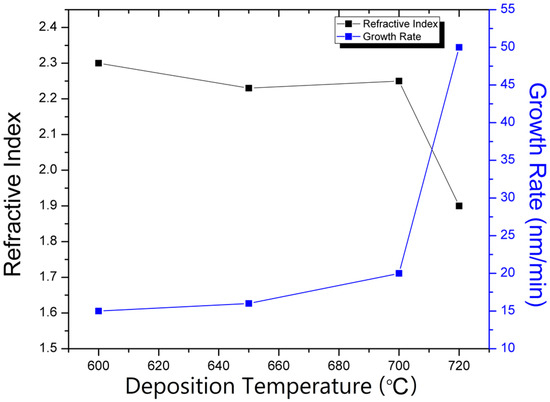 Figure 4 shows the deposition rate and refractive index dependence on temperature. In this case, we can observe that the growth rate was lower when 600 to 700 °C deposition temperatures were used, and it only increased when 720 °C was applied during deposition. The main values for the refractive index and growth rate can be seen at the intersection of both graphs; according to this, the best option to achieve the maximum growth rate with the best refractive index narc would be using a deposition temperature of 703 °C.