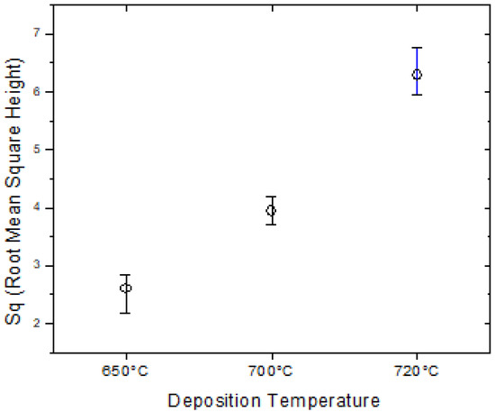 Surface morphology was studied through different roughness measurements obtained by AFM from each SRSN film. The root mean square (RMS) height (Sq) was calculated using SPIP software to analyze Tapping Mode AFM images [30,39]. Figure 5 shows Sq calculated results for the SRSN films deposited between 650 and 720 °C. The RMS values were around 2.5 and 6.8 nm on the SRSN films deposited in the range of 650 to 720 °C, respectively. A clear increase in RMS was observed as the deposition temperature was increased. In this case, an almost linear increasing dependance of Sq on the deposition temperature was obtained. The increase in the obtained RMS values could be related to the incorporation of nitrogen and hydrogen atomic content, as observed in the reported EDS values in Table 3. The replacement of silicon by nitrogen or hydrogen atoms produces different defects in the film, one of which is random roughness of the upper boundaries, with a consequent increase in RMS values. The standard deviation for SRSN films deposited at 650, 700, and 720 °C was less than 1 nm, as observed on the box plots, which indicates the homogeneity of our films deposited by LPCVD. According to the deposition parameters, the highest surface roughness and RMS height (Sq) were obtained when a high deposition temperature was used; this would have an influence (increase) on the reflectivity of the surface that could be achieved [39,40].