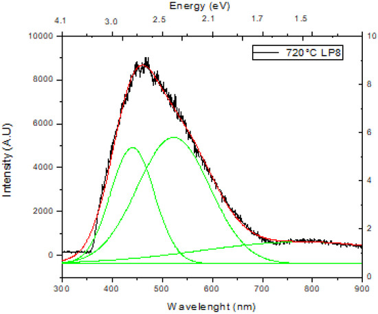 According to the similar PL behavior for the SRSN4-700 and SRSN4-720 films, a detailed analysis was obtained only through the deconvolution of the PL from the SRSN film deposited at 720 °C, as shown in Figure 7. Three emission bands were identified, the first one in the near-infrared region (NIR), the second in the green region, and the last one in the blue region. In the first band, we obtained a low but non-negligible emission centered at 773.3 nm (1.6 eV); this could be considered in the range of reported photoluminescence of SiNx films. There are many radiative defects that could be responsible for the emission in this region, even though this peak in strong emission has been attributed to the effect of luminescence from Si nanocrystals (nCs) embedded in this kind of matrix by other authors [41,42].