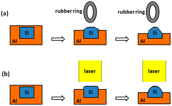 Aluminum alloy material has excellent lightweight advantages and is used in the fields of transportation and aerospace [1,2,3]. It has become an inevitable trend to replace the traditional cast iron with aluminum alloy. However, wear resistance is an important factor restricting the development of aluminum alloy. To enhance wear resistance, adding hard silicon particles to the soft aluminum matrix is an effective method. There are some researchers dedicated to research on the wear resistance of aluminum–silicon alloys [4,5,6,7,8]. Hekimolu A.P. et al. [9] proposed a method to improve the wear resistance by refining the size of silicon particles. There are also other surface treatment methods that can improve the performance of alloys, such as chemical plating, etc. [10]. The tribological property of Al-Si alloy still needs to be further improved in many applications, especially in the field of Al-Si alloy cylinder liners [11]. Walker J.C. et al. [12] expounded upon the necessity of improving the tribological behavior of Al-Si automotive cylinder liner materials. Cylinder liners undertake frequent wear tasks in daily life. There are studies indicating that silicon particles exposed on the surface could enhance the tribological property of Al-Si alloy cylinder liners [13]. Traditional chemical etching is a common way to cause the silicon particles to protrude on the surface. S. Das et al. [14] and A.R. Riahi et al. [15] described the influence of surface chemical etching on the tribological properties of Al-Si alloys. The exposed silicon particles prevent the aluminum from direct contact with the counterface. That reduces the probability of adhesive wear. And the area between two protruding silicon particles increases the oil storage space and improves the lubrication.