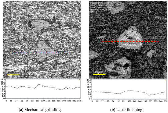 The laser finishing samples were laser-heated by a CO2 continuous transverse-flow laser. The laser defocusing value was 2 mm. The laser scanning speed was set to 600 mm/min. These tests took various laser powers (400 W, 600 W, 800 W, 1000 W, 1200 W). Figure 2 shows the surface treatment process. Silicon particles were not exposed to the surface without surface treatment. As shown in Figure 2a, silicon particles gradually protruded from the surface with mechanical grinding, and their edges were rounded. The silicon particles could protrude from the surface due to laser finishing because of aluminum covering the surface, which was evaporated. As shown in Figure 2b, silicon particles melted in the heat of the laser from the edges, and were then rounded by surface energy. In general, the outlines of silicon particles after the two surface treatments were similar, and both were exposed on the surface with rounded edges. Figure 3 shows the polished surface morphologies and outlines. Massive particles were visible on the mechanical grinding surface and laser finishing surface. The outlines presented the silicon particles with round edges which were exposed on the surface by both of the two treatments (Figure 3a,b). As can be seen from the comparison, the mechanical grinding surface was not smooth, leaving some machining marks (Figure 3a). And the laser finishing surface was relatively smooth; the silicon particles combined well with the aluminum matrix (Figure 3b). The exposure heights of the silicon particles could be measured from the outlines. Laser confocal microscopy could not only observe surface morphology, but also measure contour lines (the red dashed line represents the position of the measured contour line). The height difference between the silicon particles and the aluminum matrix is the exposure height. Each surface treatment test was repeated no less than 4 times, and the data were calculated based on the average value.