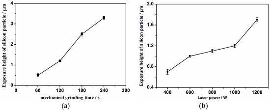 Figure 4 shows the exposure heights of silicon particles after mechanical grinding and laser finishing. As shown in Figure 4a, the exposure height was 0.5 μm when ground for 1 min, 1.2 μm for 2 min, 2.5 μm for 3 min, and 3.3 μm for 4 min. As shown in Figure 4b, the exposure height was 0.7 μm at 400 W of laser power, 1.0 μm at 600 W, 1.1 μm at 800 W, 1.2 μm at 1000 W, and 1.7 μm at 1200 W. The exposure heights increased with the mechanical grinding time and laser power. The exposure height should not increase indefinitely. With mechanical grinding, the silicon particles easily fell off if they protruded too high. Based on experience, the protrusion height accounts for about 3/4 of the overall height of silicon particles and is prone to detachment during friction [16]. Through laser finishing, increasing the laser power increases the exposure height of the silicon particles, but excessive laser power could burn out the surfaces of the samples. Therefore, the exposure height should stay in a certain range under any surface treatment.