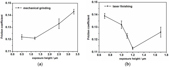 The friction coefficients of samples: (a) mechanical grinding, (b) laser finishing.