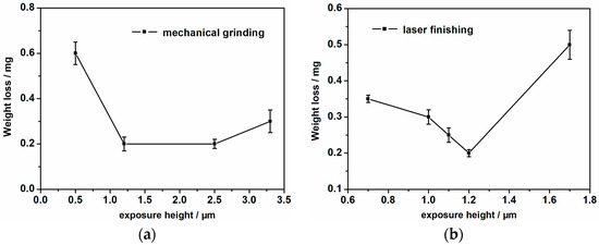 The weight losses of samples: (a) mechanical grinding, (b) laser finishing.