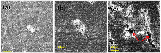 The worn surface morphology of Al-Si alloy cylinder liner samples after laser finishing is shown in Figure 9. When the exposure height of the silicon particles was lower, aluminum also easily covered the silicon particles during the friction process (Figure 9a). When the exposure height of the silicon particle was suitable, the massive silicon particle was visible, remaining on the worn laser finishing surface (Figure 9b). When the exposure height of the silicon particle was higher, the silicon particle did not fall off, but it was not combined well with the matrix (Figure 9c). There were gaps which appeared at the junction.